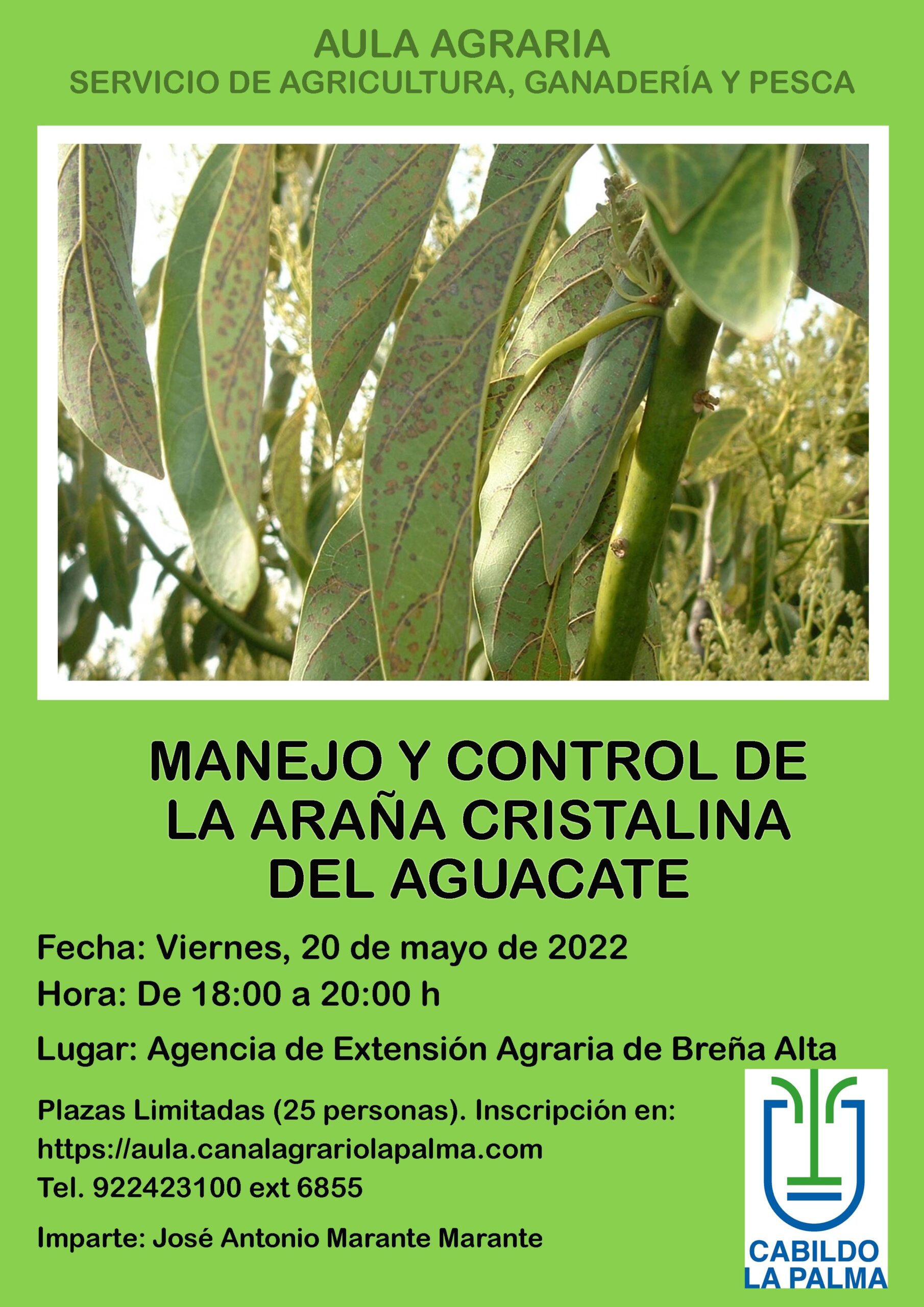 El Servicio de Agricultura, Ganadería y Pesca del Cabildo de la Palma organiza «Manejo y control de la araña cristalina del aguacate», que tendrá lugar el 20 de mayo de 2022.