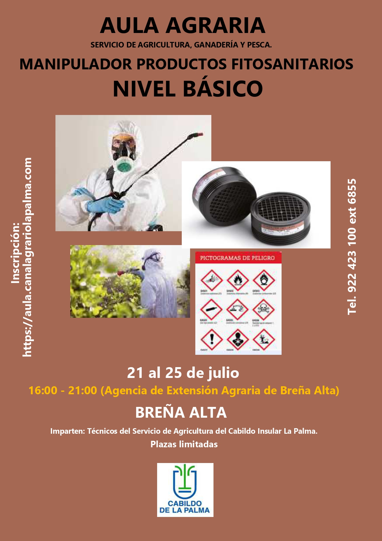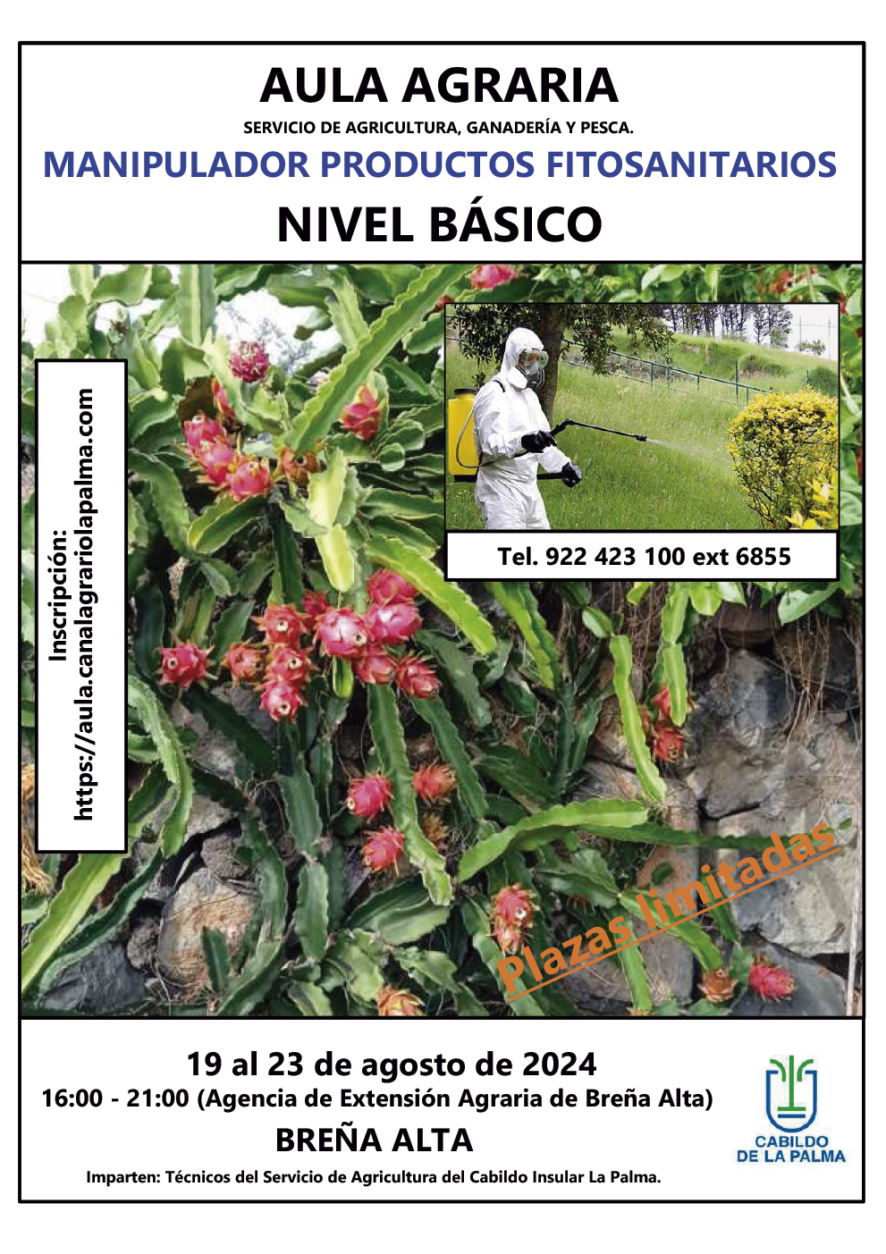 El Servicio de Agricultura, Ganadería, Pesca y Soberanía Alimentaria del Cabildo Insular de La Palma organiza el curso de «Manipulador Productos Fitosanitarios Nivel Básico» en Breña Alta. Fecha: del 19 al 23 de agosto de 2024, de 16 a 21 horas Lugar: Agencia de Extensión Agraria de...
