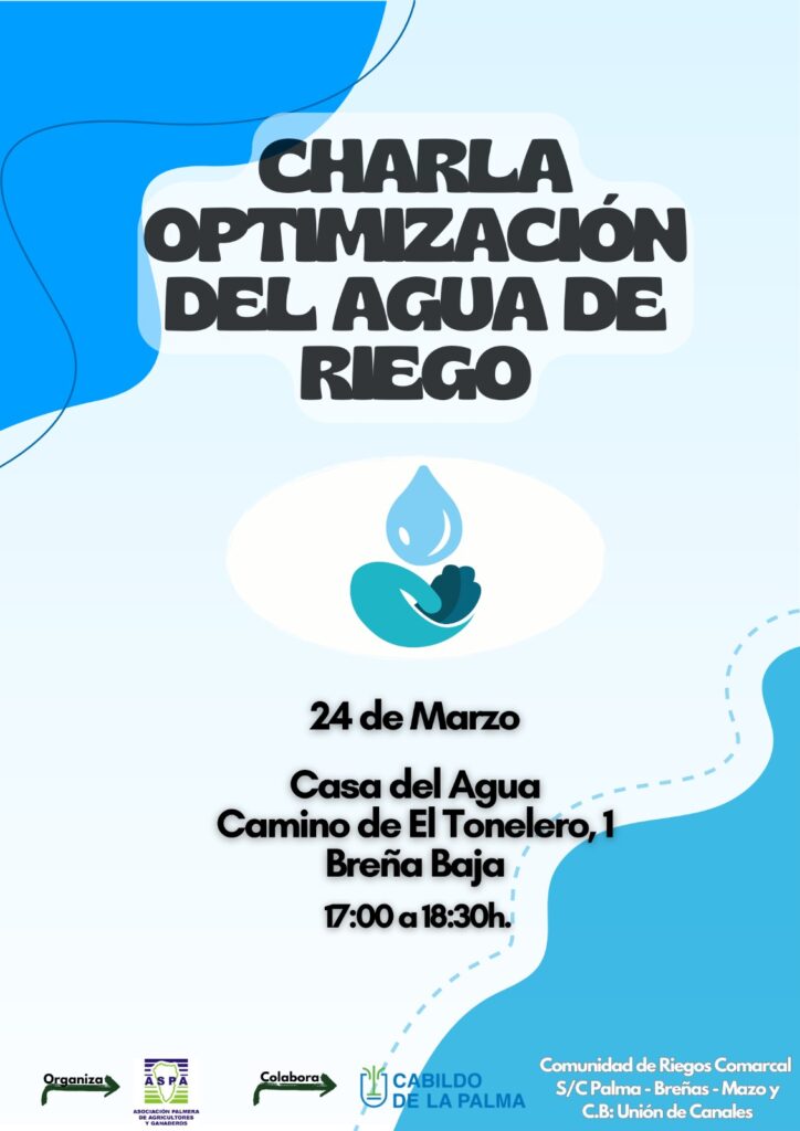 La Asociación Palmera de Agricultores y Ganaderos, ASPA, organiza la charla «Optimización del agua de riego» que tendrá lugar el 24 de marzo de 2025 de 17:00 a 18:30 en Breña Baja. Cuenta con la colaboración de: Cabildo de La Palma y La Comunidad de Riegos Comarcal S/C Palma – Breñas – Mazo y C.B. Unión de Canales.