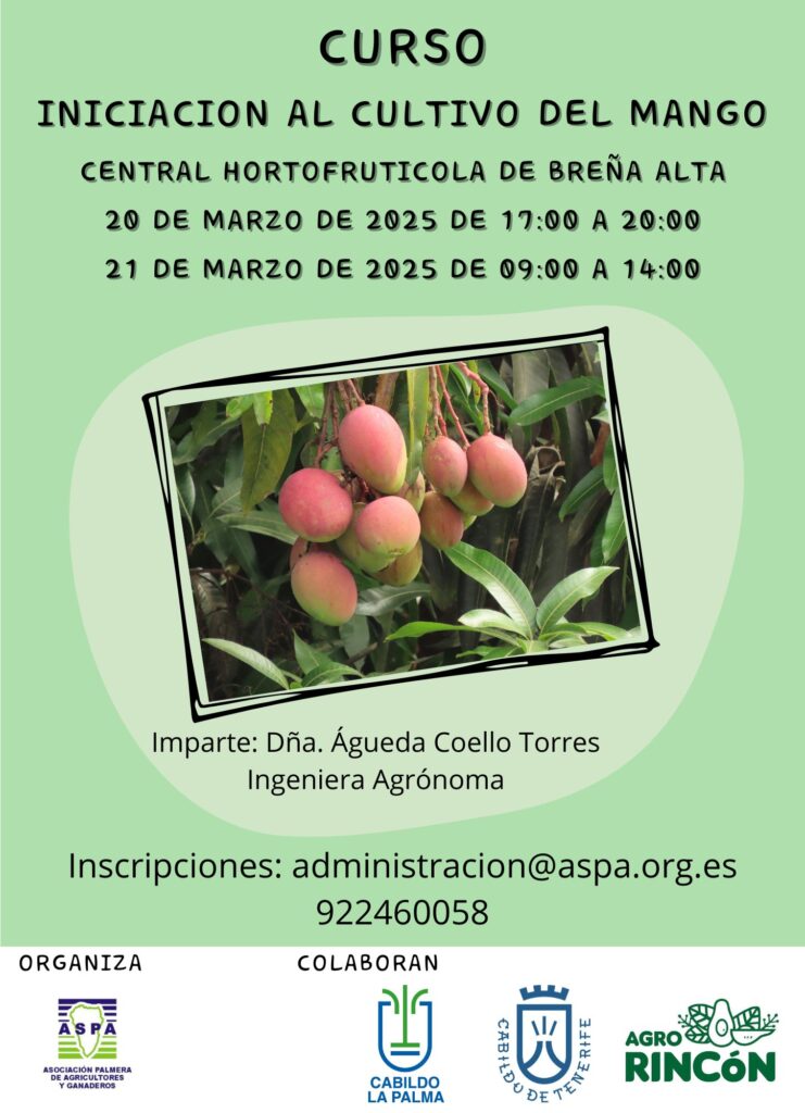 La Asociación Palmera de Agricultores y Ganaderos, ASPA, organiza el curso «Iniciación al Cultivo del Mango» que tendrá lugar 20 y 21 de marzo de 2025 en Breña Alta. ICuenta con la colaboración de: Cabildo de La Palma, Cabildo de Tenerife y Agro Rincón.
