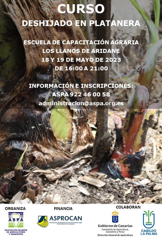 La Asociación Palmera de Agricultores y Ganaderos, ASPA, organiza el curso de «Deshijado en platanera» que tendrá lugar en la Escuela de Capacitación Agraria de Los Llanos de Aridane los días 18 y 19 de mayo de 2023 de 16:00 a 21:00 horas.