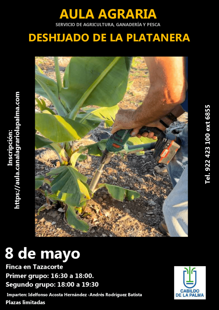 El Servicio de Agricultura, Ganadería y Pesca del Cabildo de la Palma organiza «Jornada Práctica Deshijado de Platanera», que tendrá lugar el 8 de mayo de 2023.