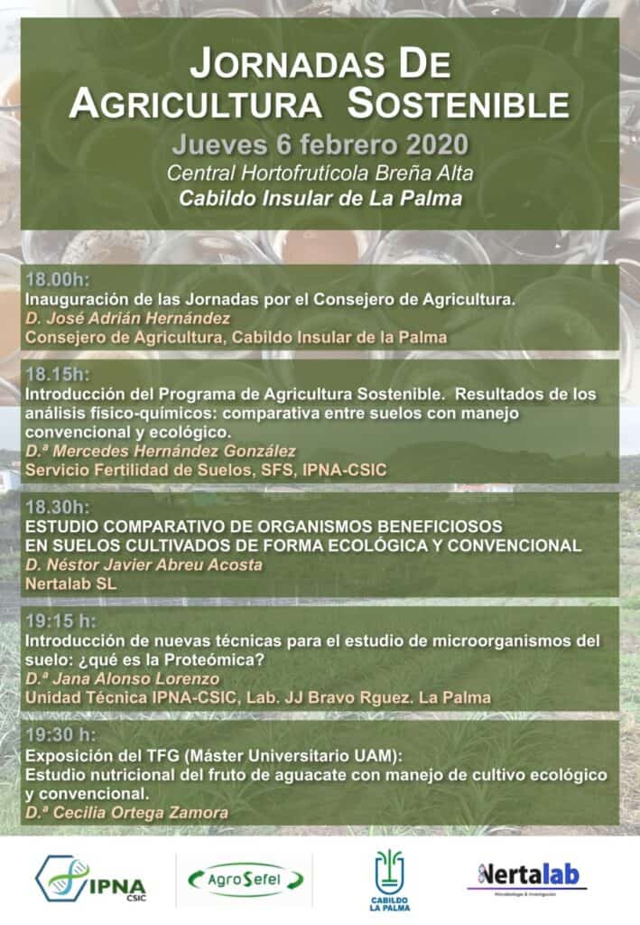 El salón de actos de la Central Hortofrutícola del Cabildo Insular de La Palma, en Breña Alta, acoge el próximo jueves, 6 de febrero, a las 18:00 horas, las Jornadas de Agricultura Sostenible, fruto del acuerdo de colaboración entre la Corporación Insular y el Instituto de Productos Naturales y Agrobiología (IPNA), perteneciente al Centro Superior de Investigaciones Científicas (CSIC).