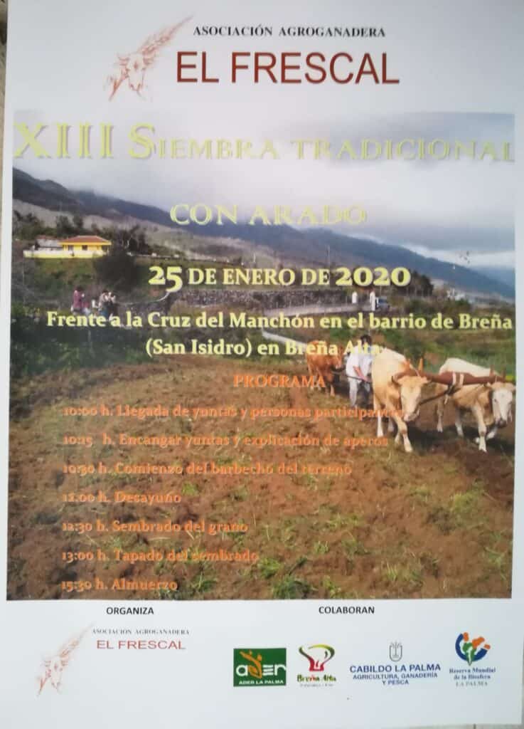 El programa de la citada edición de la Siembra tradicional con arado comenzará la jornada citada a las 10:00 horas con la llegada de yuntas y personas participantes; a las 10:30 horas está previsto el inicio del barbecho del terreno. A continuación, tras el desayuno, a las 12.30 horas, se procederá al sembrado del grano; y a las 13:00 horas se llevará a cabo el tapado del sembrado, estando previsto el almuerzo para las 15:30 horas.