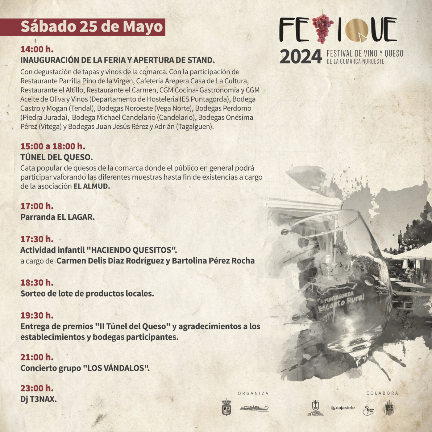 En el entorno de la Feria, contaremos con una cata popular denominada “El túnel del queso” a cargo de la asociación El Almud, en el que se procederá a las valoraciones de los asistentes. Por otra parte, la actuación de la parranda ‘El Lagar’ y la actividad “Haciendo Quesitos” para los más pequeños de la mano de las queseras Carmen Delis Díaz y Bartolina Pérez, que darán paso a sorteos y la entrega de premios de la cata “El túnel del queso” en una jornada que se ofrecerá como colofón el concierto del grupo “Los Vándalos” a las 21:00 horas y Dj T3NAX a partir de las 23:00 horas.