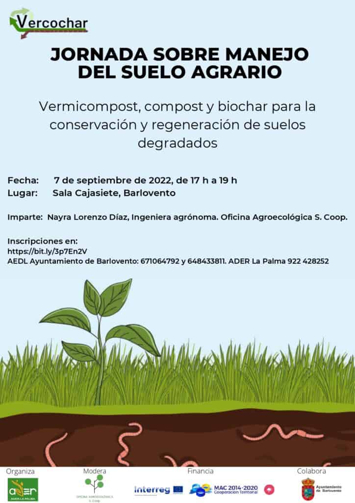 El próximo 7 de septiembre la Asociación para el Desarrollo Rural de la Isla de La Palma (ADER La Palma) organiza una nueva jornada sobre el «Manejo del suelo agrario: Vermicompost, compost y biochar para la conservación y regeneración de suelos degradados», cofinanciado por el Programa de Cooperación Interreg MAC 2014-2020.