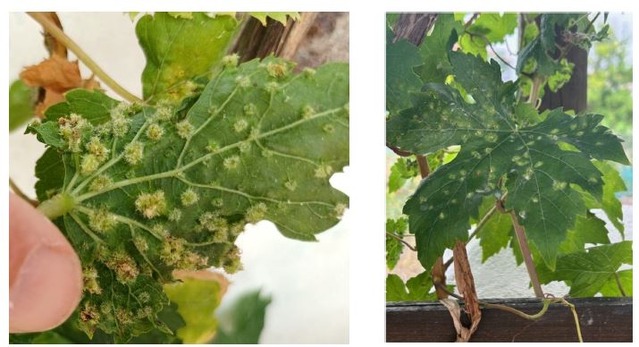 ◦ En el viñedo, la plaga se extiende «como una mancha de aceite» de planta a planta y, en su fase aérea, por el viento a corta distancia. La especie europea (Vitis vinifera) es extremadamente sensible a los ataques radicícolas.