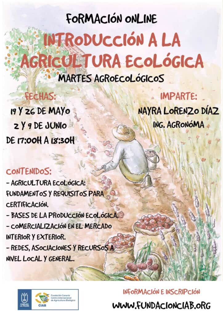 Las sesiones formativas online se realizarán los martes días 19, y 26 de mayo, y 2 y 9 de junio en horario de 17:00 a 18:30 horas. Para realizar la formación será necesario contar con ordenador y conexión a Internet. Las inscripciones se podrán realizar en la página web de la Fundación Canaria CIAB https://www.fundacionciab.com/introduccion-a-la-agricultura-ecologica/