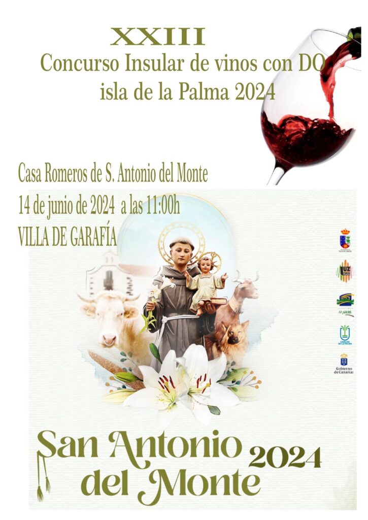 Las fiestas patronales en honor a San Antonio del Monte volverán a acoger el concurso insular al que pueden presentarse vinos de la isla producidos al amparo de la Denominación de Origen «La Palma». El concurso se realizará el día 14 de junio en la Villa de Garafía, y los vinos presentados deben estar inscritos antes del día 7.