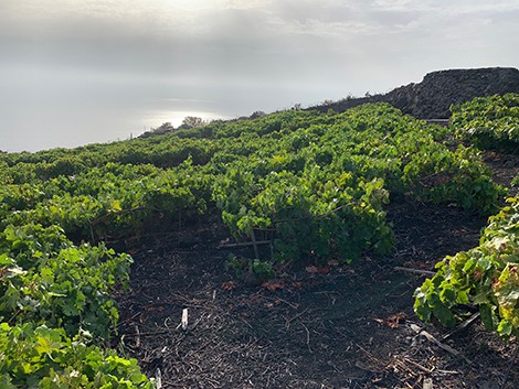 Confinadas entre el azul del mar y del cielo, y recortadas sobre la ceniza, las viñas de Llanos Negros dibujan un paisaje un tanto anárquico, pero mágico y también frágil a juzgar por el número creciente de bancales y parcelas abandonadas. Las producciones son bajas, la presión de la fauna aumenta (se ven ya parcelas valladas) y a todo ello se suma la pertinaz sequía de los últimos años. “Sin agua, las plantas se mueren”, dice Arnulio, quien, al menos, tiene capacidad para hacer un riego de invierno. Antes cultivaba también listán blanco, pero el precio más bajo de esta uva no compensa los desvelos, nos cuenta.
