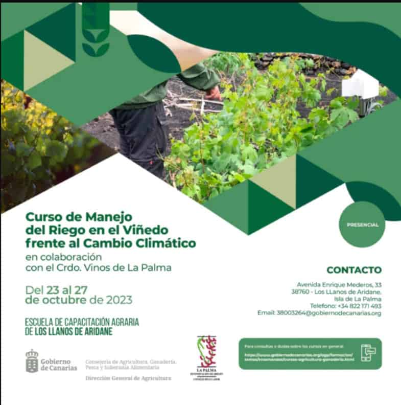 La Escuela de Capacitación Agraria de Los Llanos de Aridane en colaboración con el Consejo Regulador de la Denominación de Origen de Vinos de La Palma, anuncia la convocatoria de un curso especializado sobre el manejo del riego en viñedos con enfoque en la adaptación al cambio climático. Esta formación se llevará a cabo desde el 23 al 27 de octubre de 2023.
