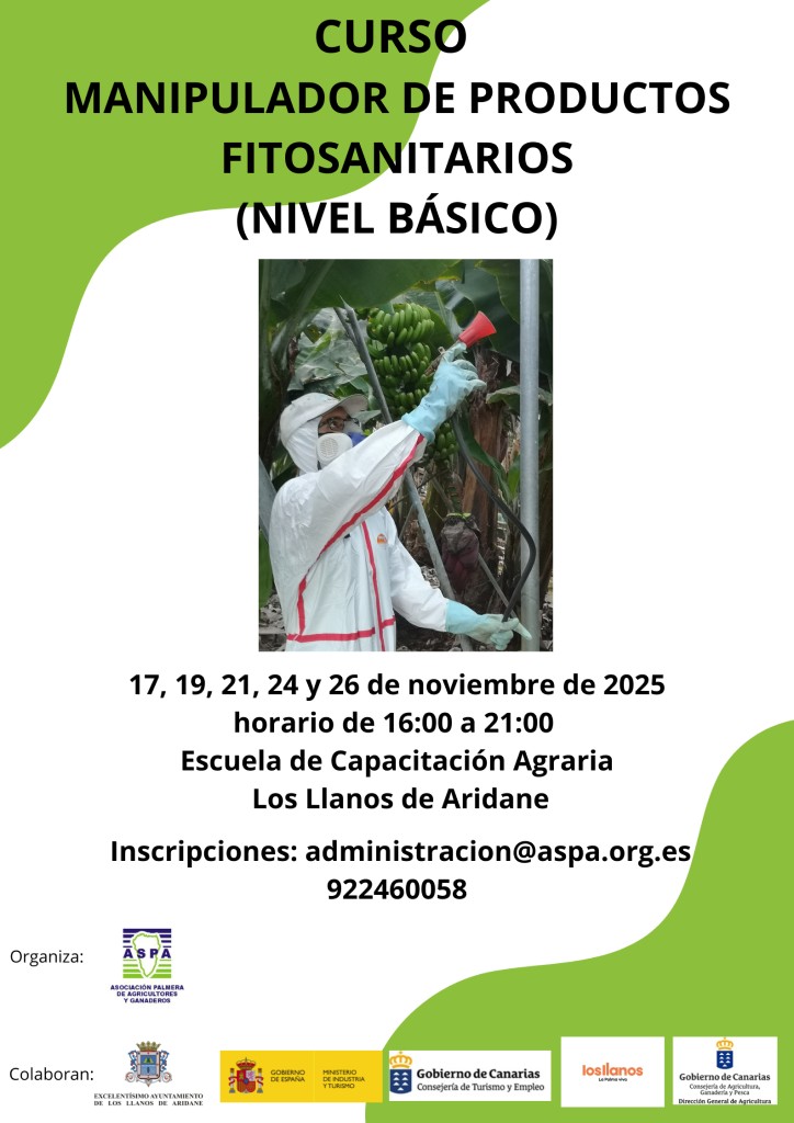 La Asociación Palmera de Agricultores y Ganaderos (ASPA) organiza un nuevo curso de Manipulador de Productos Fitosanitarios (Nivel Básico), dirigido a todas aquellas personas interesadas en obtener la formación necesaria para el uso seguro y responsable de productos fitosanitarios.