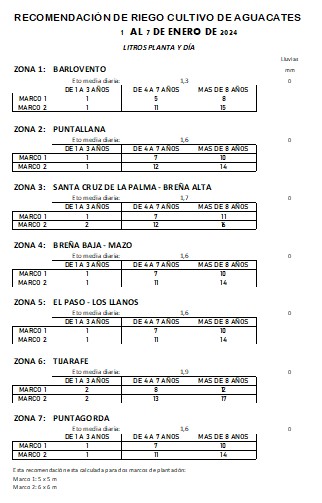 Recomendación de riego en Aguacate del 1 al 7 de enero de 2024