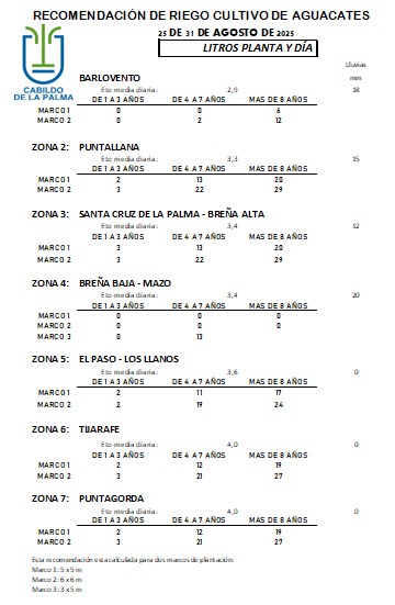 Recomendación de riego en Aguacate del 25 al 31 de agosto de 2025