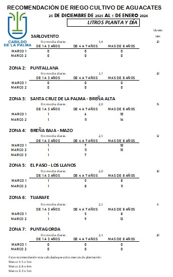 Recomendación de riego en Aguacate del 25 de diciembre de 2025 al 1 de enero de 2026