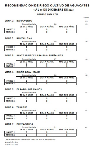 Las recomendaciones de riego se basan en los datos aportados por la Red de Estaciones SIAR, situadas en cotas medias del cultivo del aguacate. Por lo tanto estás son datos estándar, que dependiendo de la cota de la finca, del tipo de suelo y la red de suministro estos datos tendrán que ser ajustados.
