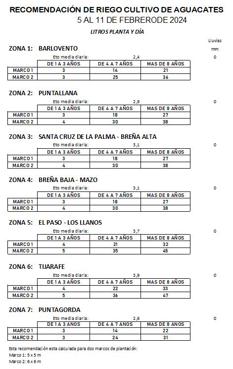 Recomendación de riego en Aguacate del 5 al 11 de febrero de 2024