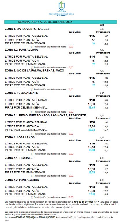 Las recomendaciones de riego se basan en los datos aportados por la Red de Estaciones SIAR, situadas en cotas medias del cultivo del plátano. Por lo tanto estás son datos estándar, que dependiendo de la cota de la finca, del tipo de suelo y la red de suministro estos datos tendrán que ser ajustados.