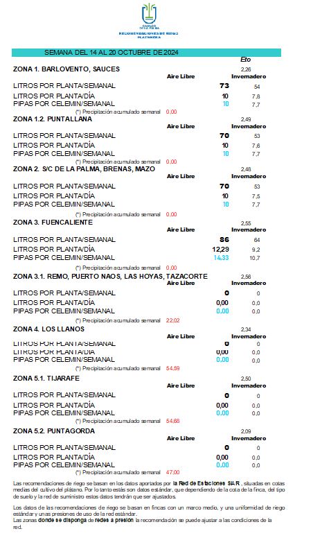 Las recomendaciones de riego se basan en los datos aportados por la Red de Estaciones SIAR, situadas en cotas medias del cultivo del plátano. Por lo tanto estás son datos estándar, que dependiendo de la cota de la finca, del tipo de suelo y la red de suministro estos datos tendrán que ser ajustados.