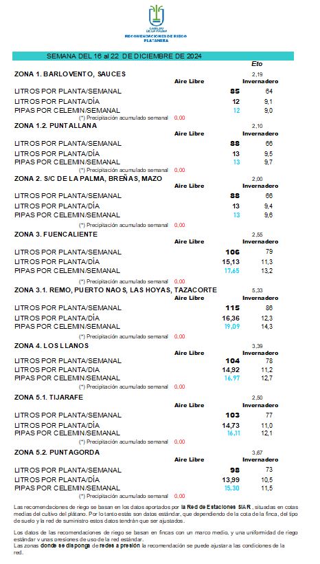 Las recomendaciones de riego se basan en los datos aportados por la Red de Estaciones SIAR, situadas en cotas medias del cultivo del plátano. Por lo tanto estás son datos estándar, que dependiendo de la cota de la finca, del tipo de suelo y la red de suministro estos datos tendrán que ser ajustados.