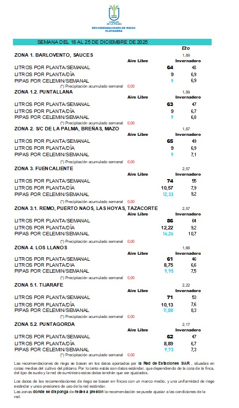 Las recomendaciones de riego se basan en los datos aportados por la Red de Estaciones SIAR, situadas en cotas medias del cultivo del plátano. Por lo tanto estás son datos estándar, que dependiendo de la cota de la finca, del tipo de suelo y la red de suministro estos datos tendrán que ser ajustados.