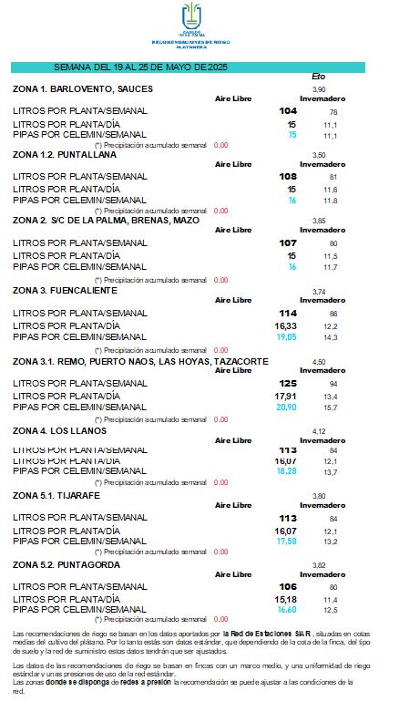 Las recomendaciones de riego se basan en los datos aportados por la Red de Estaciones SIAR, situadas en cotas medias del cultivo del plátano. Por lo tanto estás son datos estándar, que dependiendo de la cota de la finca, del tipo de suelo y la red de suministro estos datos tendrán que ser ajustados.
