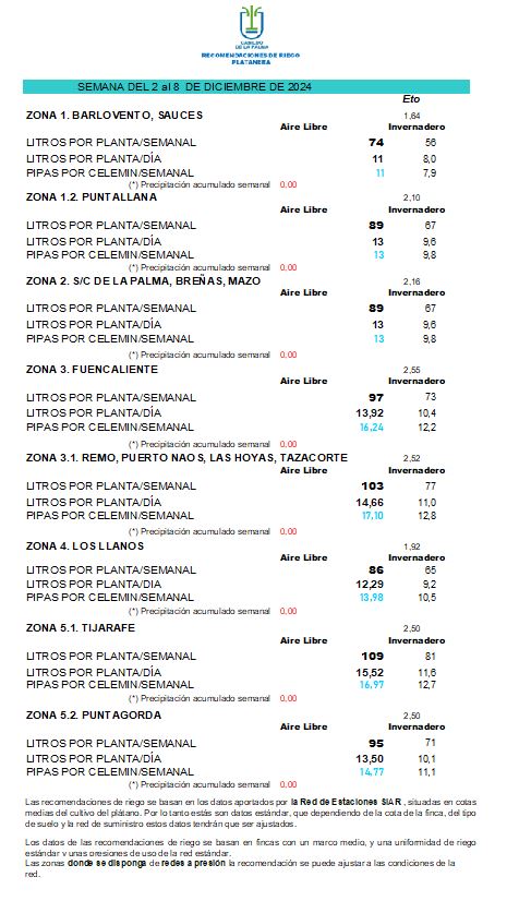 Las recomendaciones de riego se basan en los datos aportados por la Red de Estaciones SIAR, situadas en cotas medias del cultivo del plátano. Por lo tanto estás son datos estándar, que dependiendo de la cota de la finca, del tipo de suelo y la red de suministro estos datos tendrán que ser ajustados.