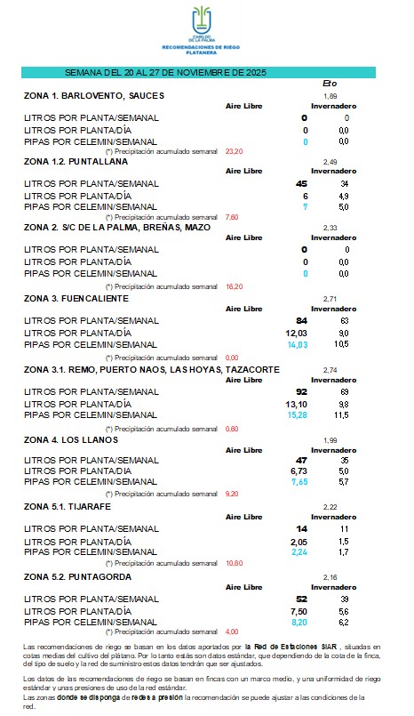 Las recomendaciones de riego se basan en los datos aportados por la Red de Estaciones SIAR, situadas en cotas medias del cultivo del plátano. Por lo tanto estás son datos estándar, que dependiendo de la cota de la finca, del tipo de suelo y la red de suministro estos datos tendrán que ser ajustados.