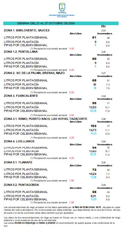 Las recomendaciones de riego se basan en los datos aportados por la Red de Estaciones SIAR, situadas en cotas medias del cultivo del plátano. Por lo tanto estás son datos estándar, que dependiendo de la cota de la finca, del tipo de suelo y la red de suministro estos datos tendrán que ser ajustados.