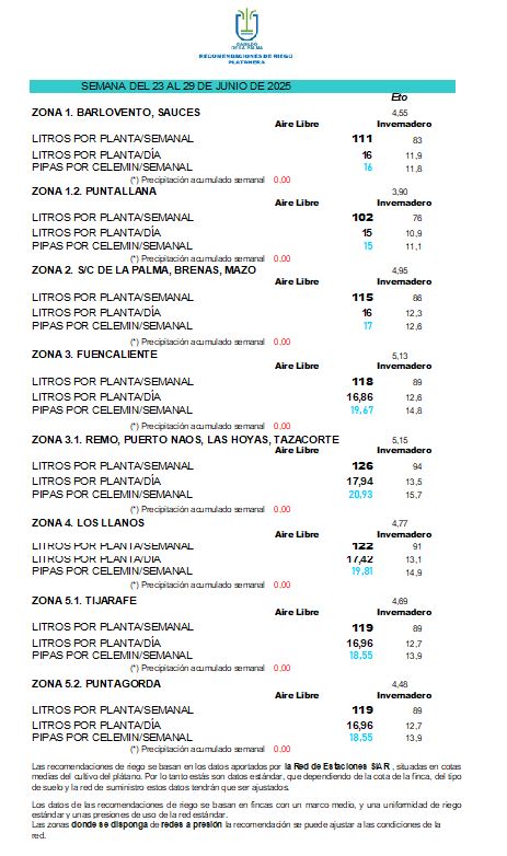 Las recomendaciones de riego se basan en los datos aportados por la Red de Estaciones SIAR, situadas en cotas medias del cultivo del plátano. Por lo tanto estás son datos estándar, que dependiendo de la cota de la finca, del tipo de suelo y la red de suministro estos datos tendrán que ser ajustados.