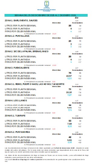 Recomendación de riego en platanera del 25 de diciembre de 2025 al 1 de enero de 2026