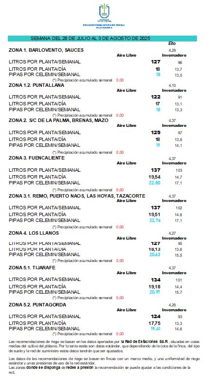 Las recomendaciones de riego se basan en los datos aportados por la Red de Estaciones SIAR, situadas en cotas medias del cultivo del plátano. Por lo tanto estás son datos estándar, que dependiendo de la cota de la finca, del tipo de suelo y la red de suministro estos datos tendrán que ser ajustados.