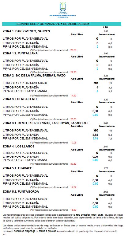 Las recomendaciones de riego se basan en los datos aportados por la Red de Estaciones SIAR, situadas en cotas medias del cultivo del plátano. Por lo tanto estás son datos estándar, que dependiendo de la cota de la finca, del tipo de suelo y la red de suministro estos datos tendrán que ser ajustados.