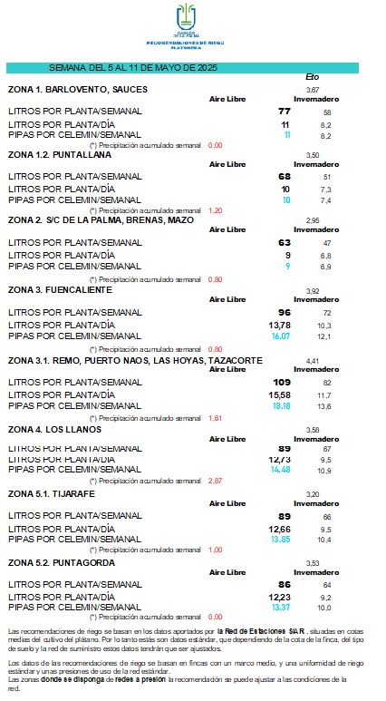 Las recomendaciones de riego se basan en los datos aportados por la Red de Estaciones SIAR, situadas en cotas medias del cultivo del plátano. Por lo tanto estás son datos estándar, que dependiendo de la cota de la finca, del tipo de suelo y la red de suministro estos datos tendrán que ser ajustados.