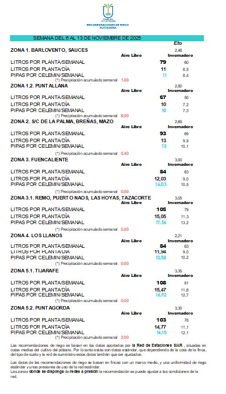Las recomendaciones de riego se basan en los datos aportados por la Red de Estaciones SIAR, situadas en cotas medias del cultivo del plátano. Por lo tanto estás son datos estándar, que dependiendo de la cota de la finca, del tipo de suelo y la red de suministro estos datos tendrán que ser ajustados.