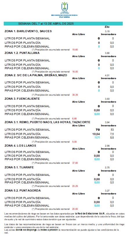 Las recomendaciones de riego se basan en los datos aportados por la Red de Estaciones SIAR, situadas en cotas medias del cultivo del plátano. Por lo tanto estás son datos estándar, que dependiendo de la cota de la finca, del tipo de suelo y la red de suministro estos datos tendrán que ser ajustados.