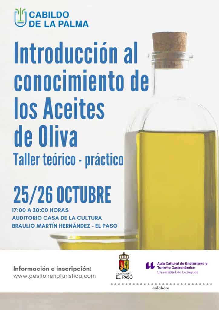 El Cabildo de La Palma, a través de la Consejería de Agricultura, Ganadería y Pesca, organiza un taller de introducción al conocimiento de los aceites de oliva. La formación, que tendrá carácter téorico y práctico, se desarrollará los días 25 y 26 de octubre en horario de 17:00 a 20:00 horas en el auditorio de la Casa de la Cultura Braulio Martín de El Paso, con la colaboración del Ayuntamiento de la localidad y del Aula de Enoturismo y Turismo Gastronómico de la Universidad de La Laguna (ULL).