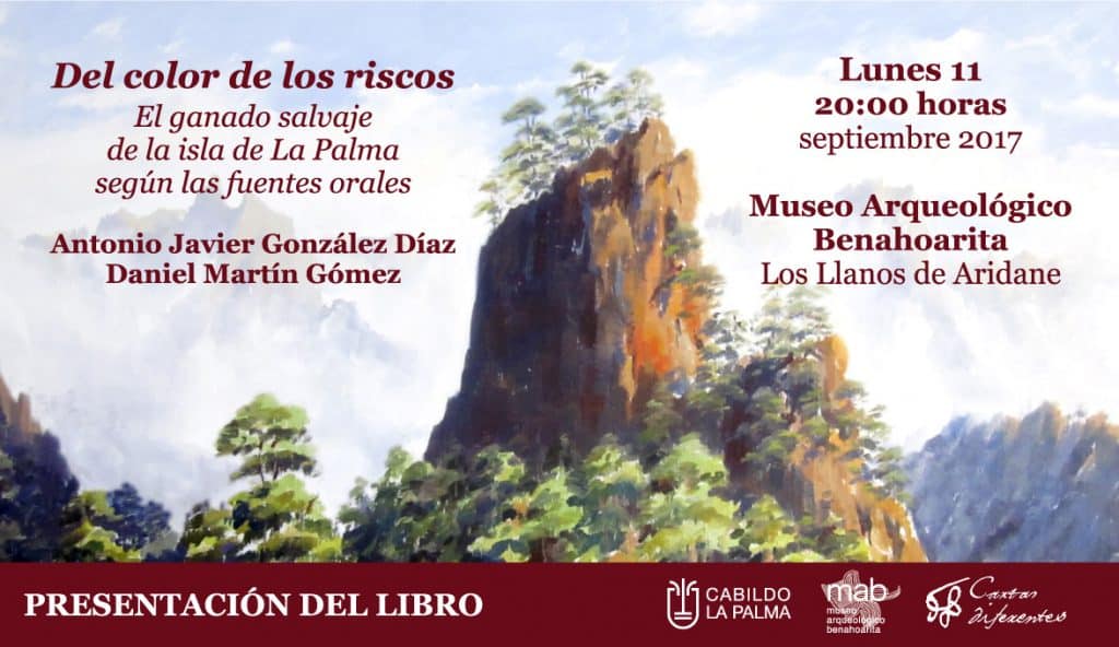 CRÓNICA DEL CAMPO les ofrece la presentación del libro, Del color de los riscos. La Consejería de Agricultura, Ganadería y Pesca del Cabildo de La Palma, junto al Ayuntamiento de Santa Cruz de La Palma y Cartas Diferentes Ediciones. La presentación del libro «Del color de los riscos»: el ganado salvaje de la isla de La Palma según las fuentes orales, de los autores Antonio Javier González Díaz y Daniel Martín Gómez.