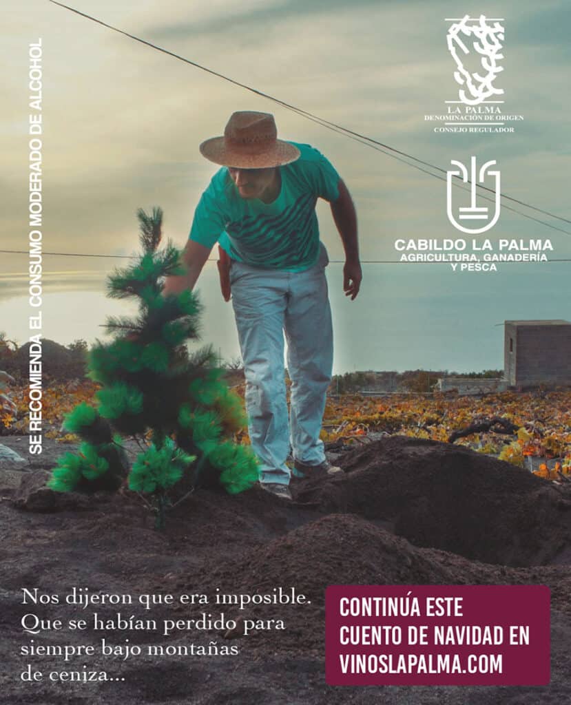 Esta sería la sinopsis de la campaña de Navidad que un año más presenta el Consejo Regulador de Vinos La Palma y que este año, rinde homenaje al esfuerzo que se ha hecho y que se continúa haciendo para recuperar las viñas que quedaron sepultadas bajo montañas de ceniza. Pero también es un homenaje a todos esos palmeros y palmeras que han puesto toda su ilusión, su esfuerzo y su solidaridad en apoyar y ayudar a todas esas personas que, de una u otra manera, se vieron afectadas por la erupción.